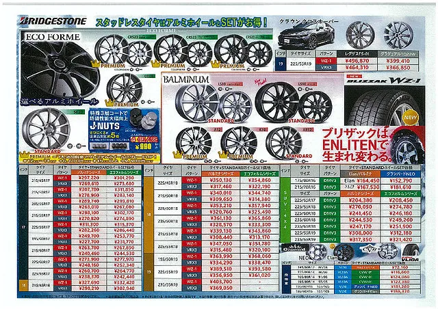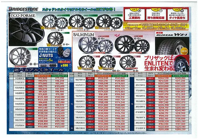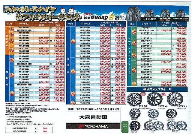 当社ではヨコハマタイヤ、ブリヂストンタイヤの販売を行っております。これからのウィンターシーズンにはスタッドレスタイヤは必需品です。この機会に是非、当社でスタッドレスタイヤアルミホイールセットをお買い求めください。